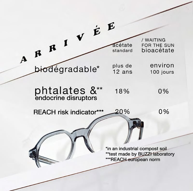 Des performances mécaniques comparables à un acétate premium, une grande stabilité, une belle brillance, et la compatibilité avec les verres optiques. En fin de vie, la matière est recyclable et peut se dégrader en conditions de compostage industriel.