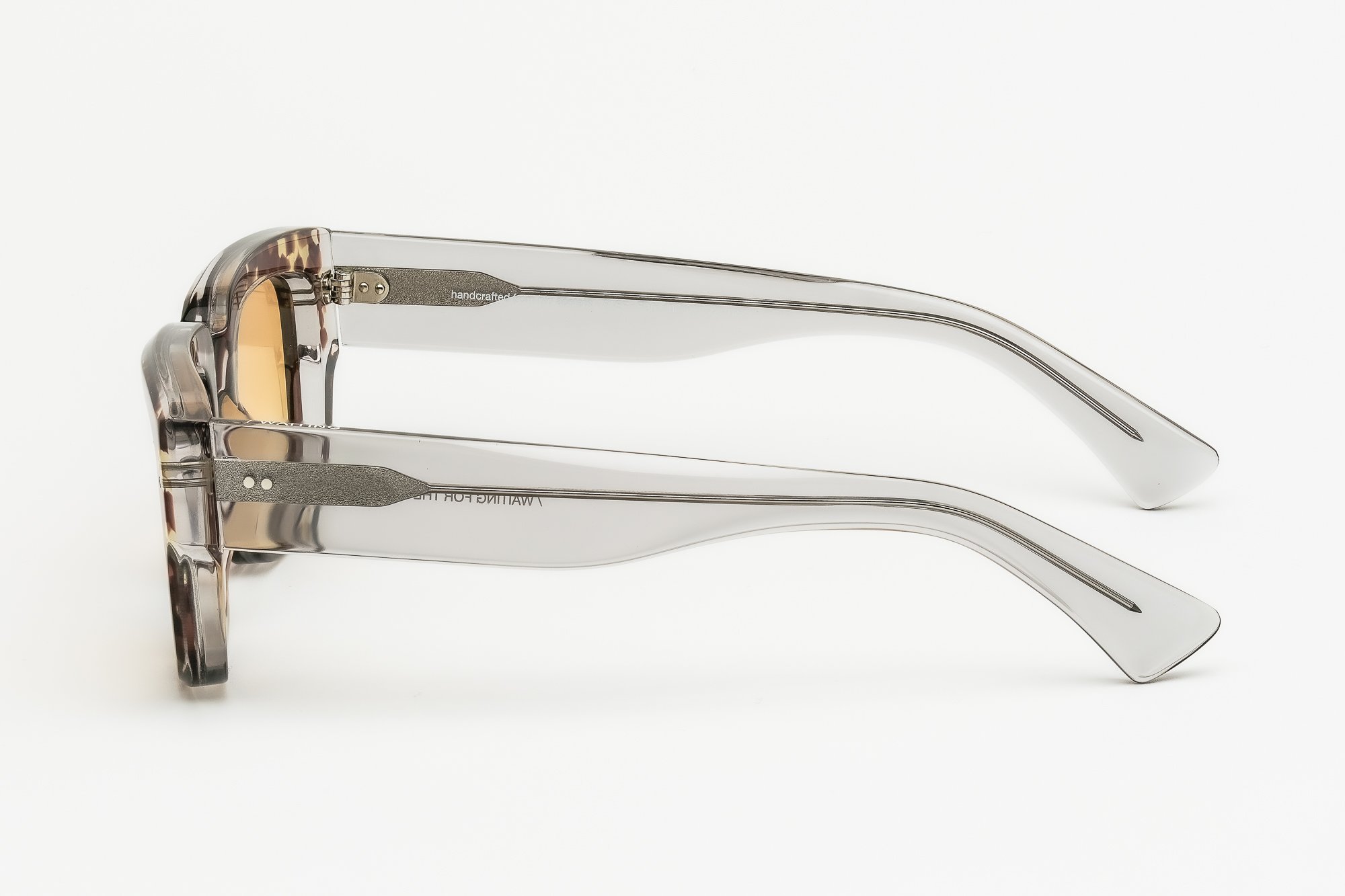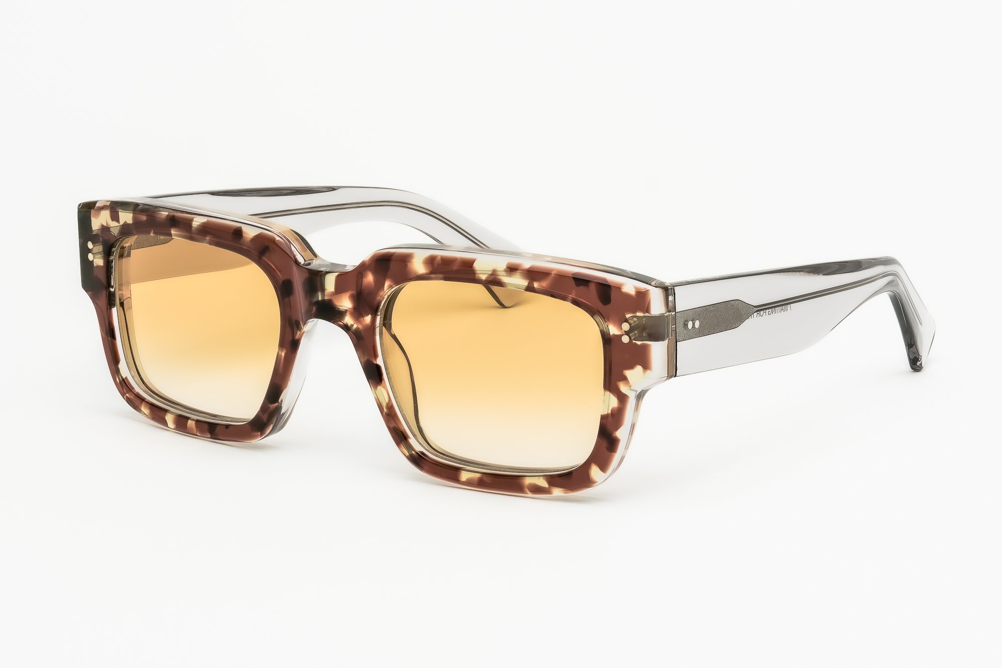 Dans cette déclinaison E20L10, la face écaille brune chaleureuse est contrastée par des branches laminées cristal fumé, laissant apparaître la structure interne de la monture. Un jeu de transparence subtil qui renforce la dimension contemporaine du modèle, sans jamais tomber dans l’ostentatoire.