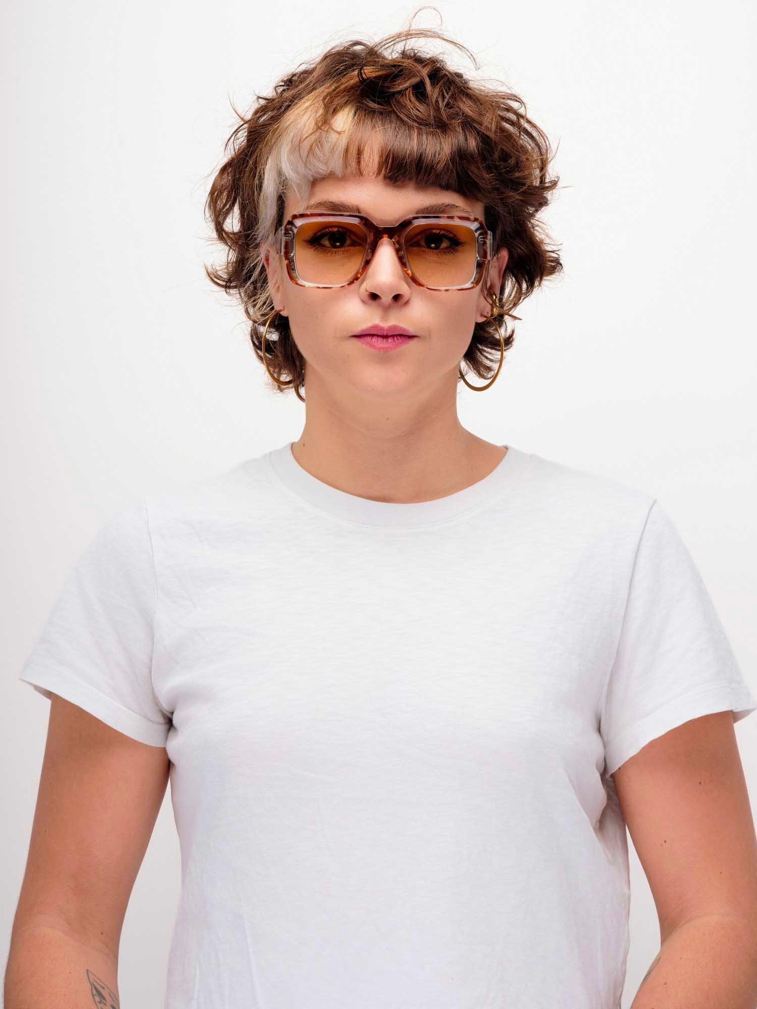 Réalisée en bio-acétate (biosourcé, recyclable et biodégradable), STEF E20L10 est équipée de verres solaires Carl Zeiss® catégorie 3, à la teinte jaune dégradée. Une signature visuelle forte, offrant une protection UV optimale et un confort visuel remarquable, même en forte luminosité.
