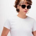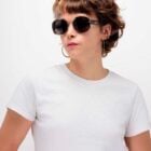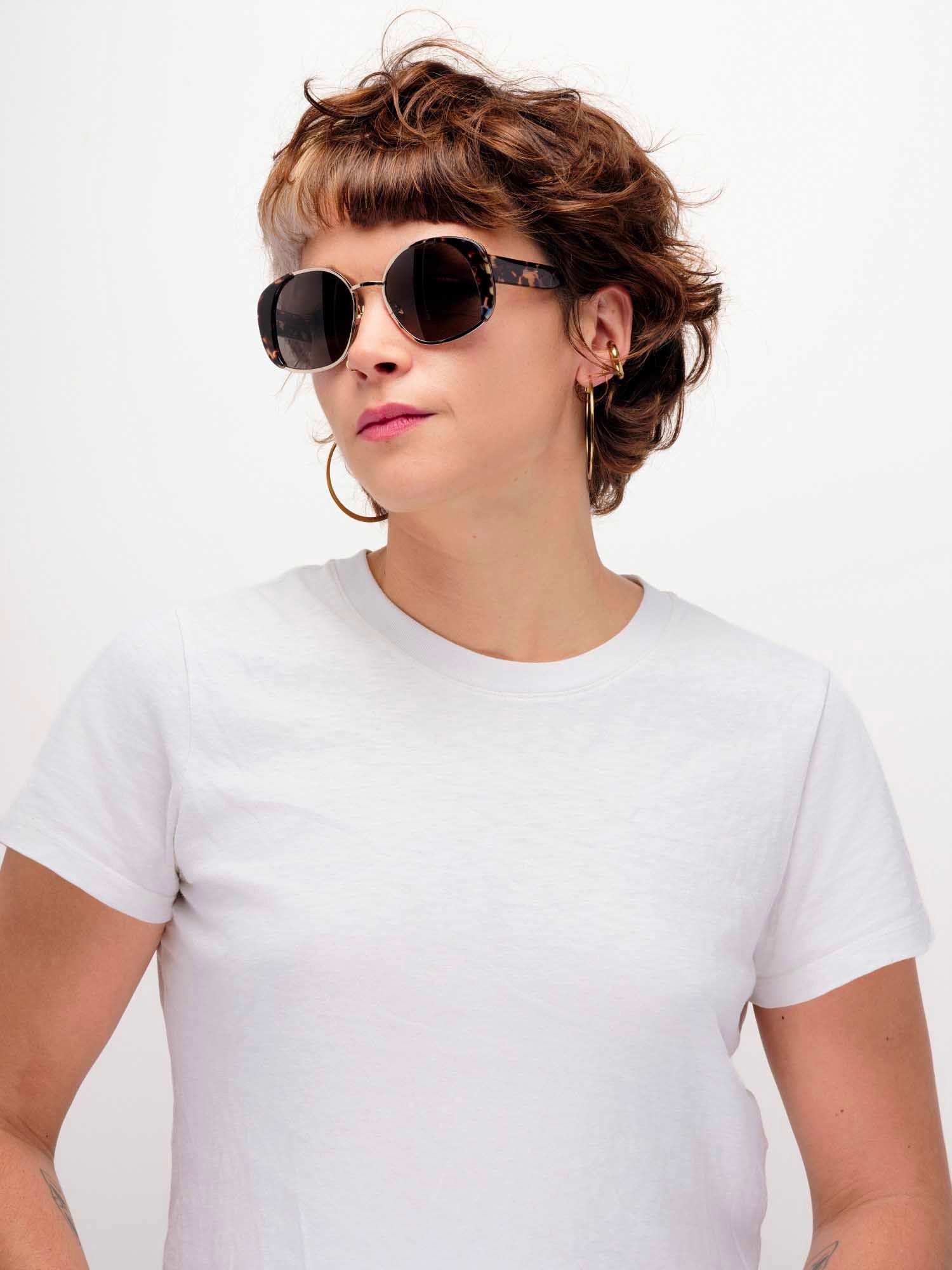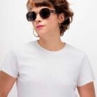 Ce modèle joue la structure avec sa combinaison unique d’acier recyclé finition silver et d’épais manchons en acétate écaille brun.