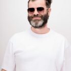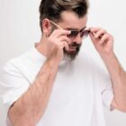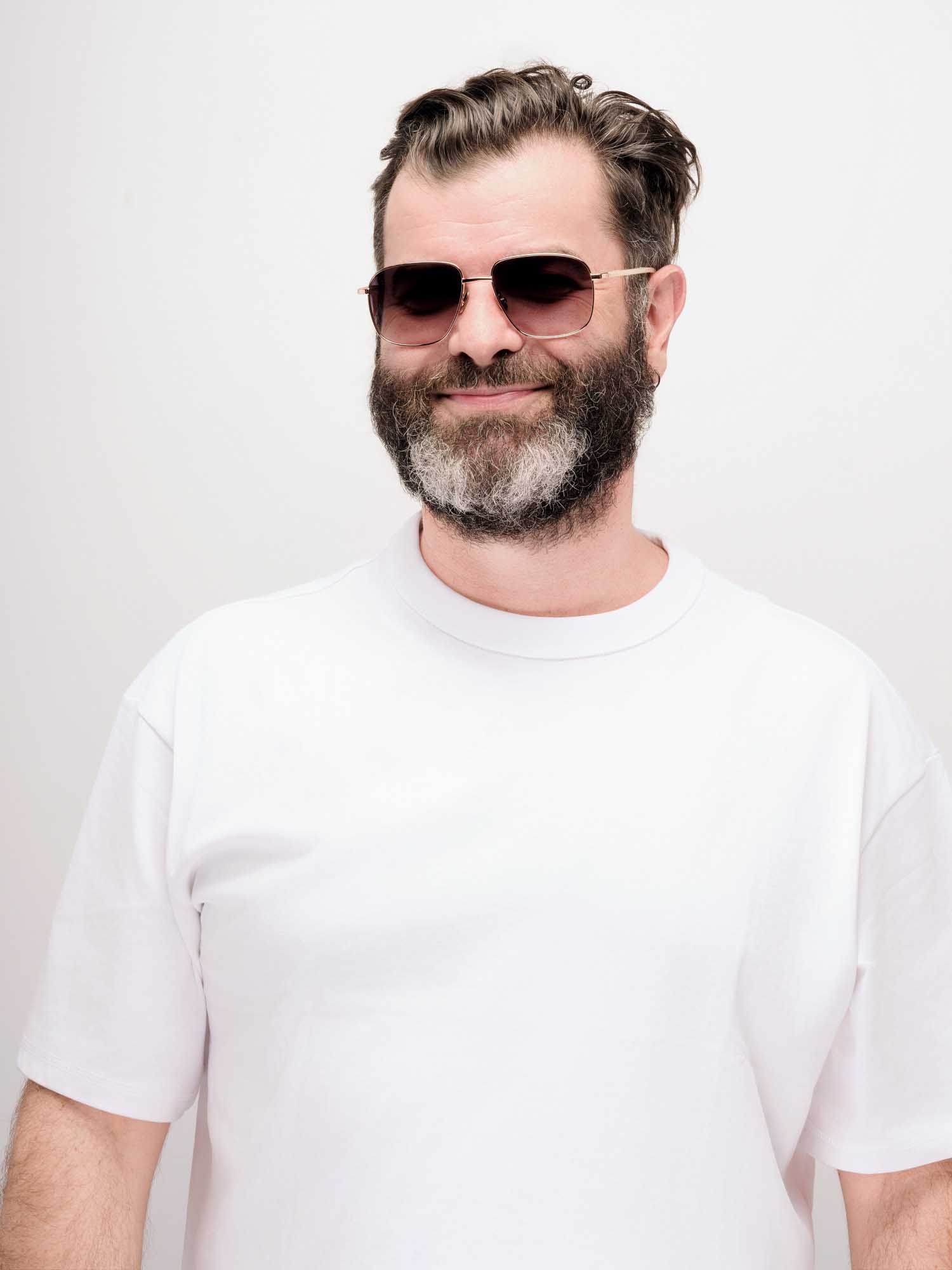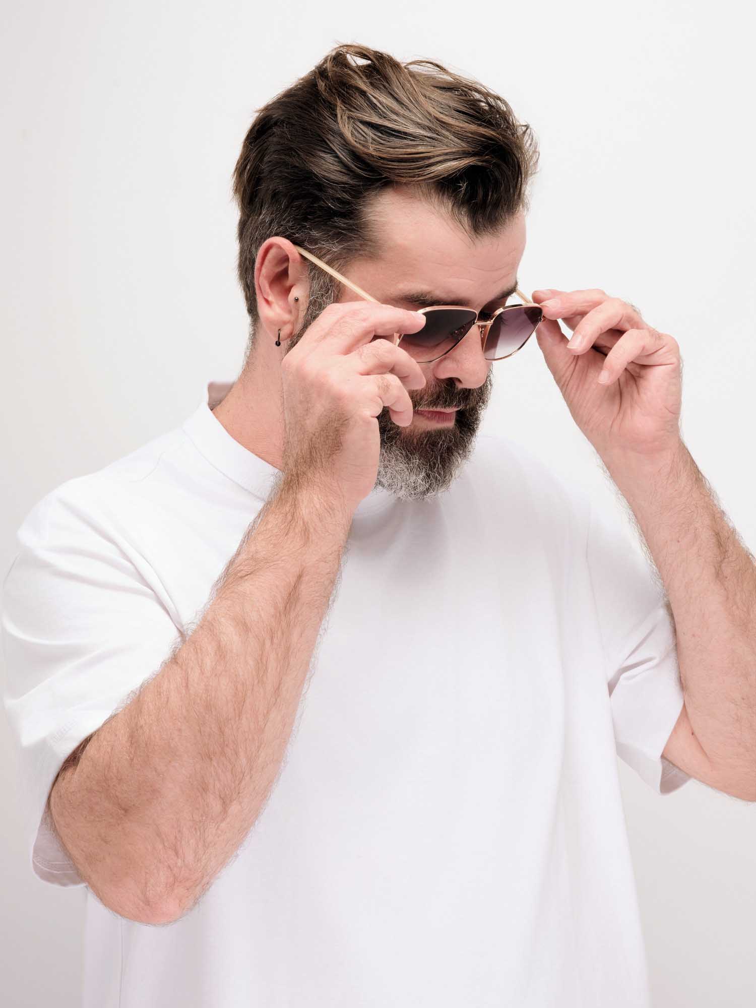 Sa monture en acier recyclé rose gold joue la carte de l’élégance, adoucie par des manchons en acétate crystal sable.